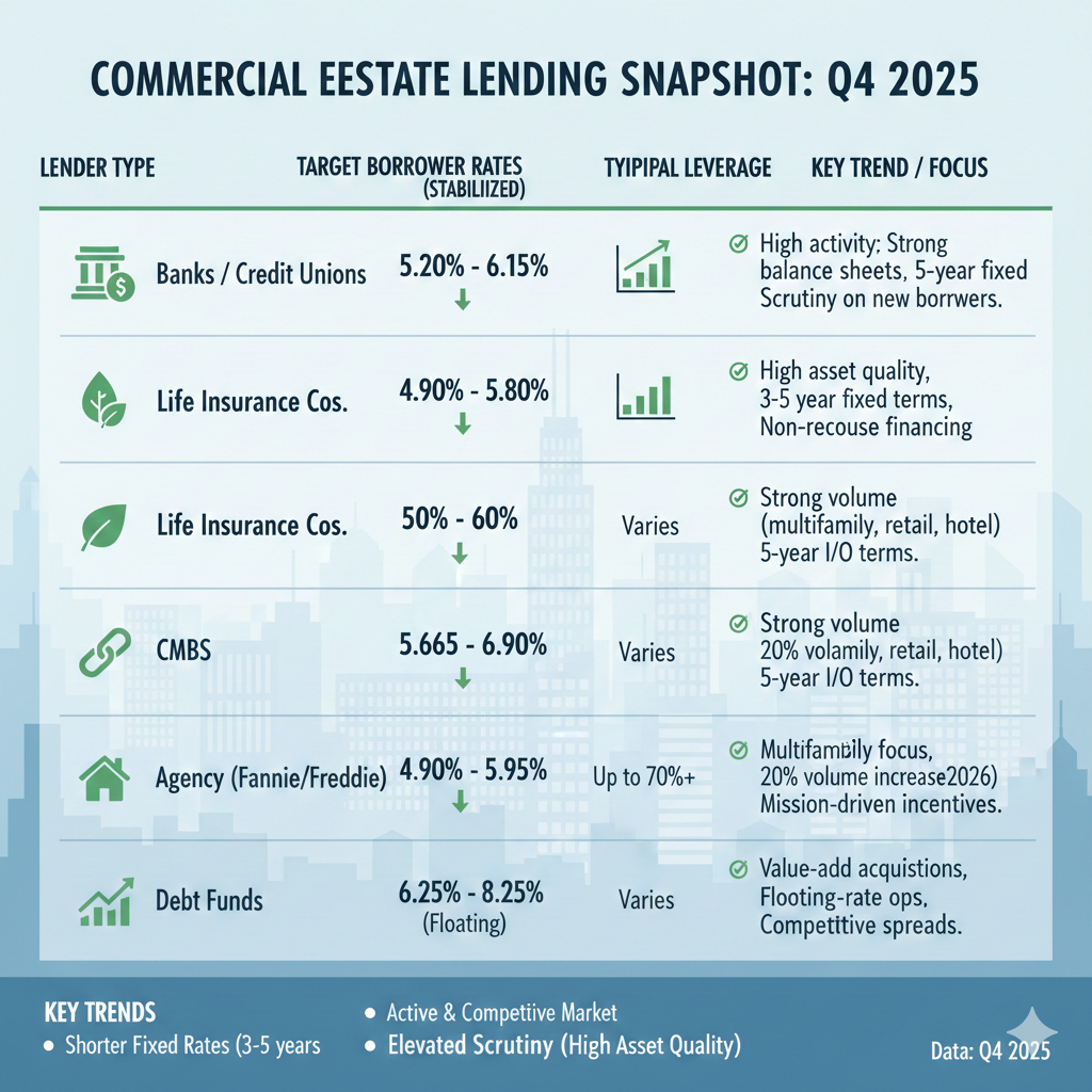 Despite the macroeconomic uncertainty, the capital markets for commercial real estate (CRE) lending are showing significant signs of improvement. Lender production targets for 2026 are uniformly higher, and competition is driving down spreads and borrowing rates, particularly on the short end of the curve.